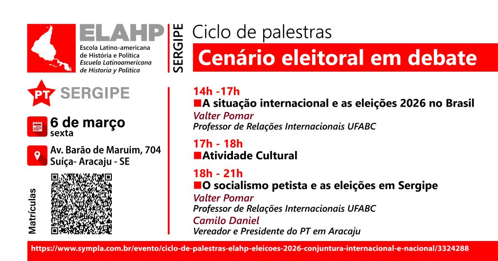 PROGRAMAÇÃO 6 de Março de 2026 14h -17h A situação internacional e as eleições 2026 no Brasil Valter Pomar Professor de Relações Internacionais UFABC 17h – 18h Atividade Cultural 18h – 21h O socialismo petista e as eleições em Sergipe Valter Pomar Professor de Relações Internacionais UFABC Camilo Daniel Vereador e Presidente do PT em […]